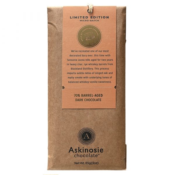 “Back by popular demand! We’ve recreated one of our most decorated bars ever and we think this is the best version yet. We aged robust Trinitario cocoa nibs (the inside of the bean) for two years (!!) in heavy char rye whiskey barrels from Blackland Distillery. This process imparts subtle notes of singed oak and malty smoke with underlying tones of balanced whiskey-vanilla-sweetness.