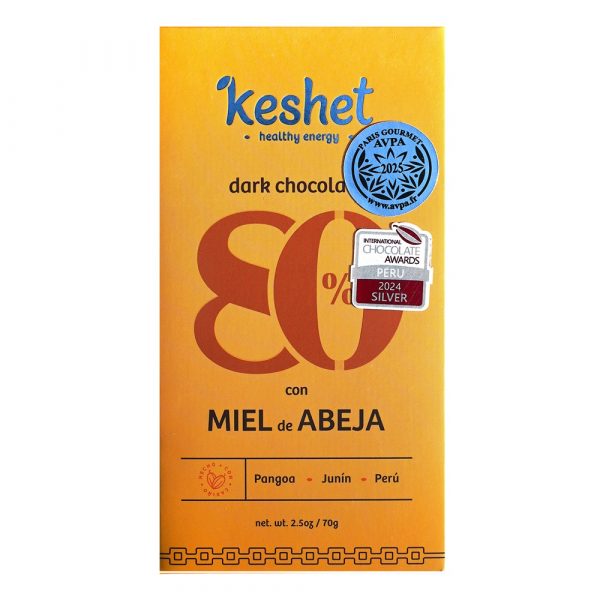80% chocolate made with honey and VRAE99 cocoa from the family run farm “Fundo Don Germรกn – Selva Virgen”, nestled in the heart of the Peruvian Amazon. Awarded Silver by the International Chocolate Awards