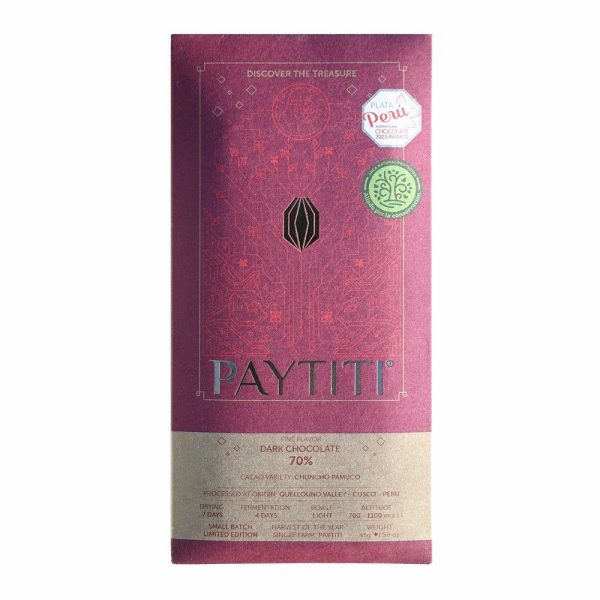 This chocolate is made from chuncho cacao beans, specifically the “Pamuco” variety.