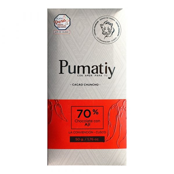 “A spicy flavour that accompanies the bitterness and the sweetness”. This 70% dark chocolate with Chilli showcases Pumatiyโs Chuncho cacao from the Cusco region of Peru.