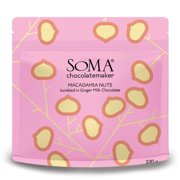 To finish each caramelized macadamia is bathed in peppery ginger milk chocolate and tumbled into radiant planets. Little worlds composed of 3 golden layers — zingy, crunchy and buttery in every bite.” – Cyn